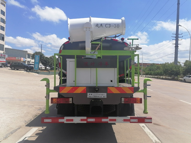 消防灑水車安裝消防車專用消防泵、消防炮、消防取力器。罐體后帶工作平臺,平臺上安裝綠化灑水炮,灑水炮可全方位旋轉,帶前沖后灑,帶側噴,可連續調成直流狀、霧狀、大雨、小雨、毛毛雨,帶安全護欄。罐體頂部安裝消防水炮。帶消防接口,可通過消防栓進水,帶自流閥,消防綠化卷盤。