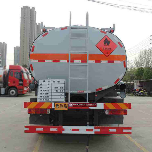 罐體有效容積:20立方米,危險貨物運輸車輛的類型為FL型,類項號:3;罐體尺寸(含50mm厚保溫層)(長×長軸×短軸)為(mm):7000×2400×1700,不含保溫層罐體尺寸(長×長軸×短軸)為(mm):6900×2300×1600;僅采用4575+1400軸距;側(cè)、后防護裝置材料材質(zhì):Q235B,側(cè)、后防護均采用螺栓連接,后防護裝置斷面尺寸為(mm):80×150,后部防護離地高度:500mm;隨底盤選裝駕駛室,選裝出口箱樣式及管廂樣式;安裝具有衛(wèi)星定位功能的行駛記錄儀,排氣管前置,安裝限速裝置,限速80km/h,僅采用底盤子午線輪胎;ABS系統(tǒng)控制器生產(chǎn)企業(yè)/型號為威伯科(上海)管理有限公司/4460046300;選裝EBS,EBS系統(tǒng)控制器生產(chǎn)企業(yè)/型號為威伯科(上海)管理有限公司/EBS3;發(fā)動機型號及油耗值(L/100km)為:MC07.27-60(36.6),MC07.31-60(36.6),MC07.34-60(36.6),MC09.35B-60(36.5), MC09.35-60(36.5),MC09.38-60(36.5),MC11.40-60(36.7).該車后軸為采用空氣懸架.轉(zhuǎn)向輪安裝爆胎應(yīng)急防護裝置.
