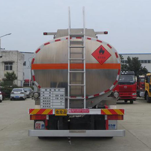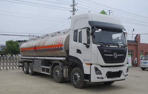 罐體有效容積:26.2立方米,危險貨物運輸車輛的類型為FL型,類項號:3;罐體尺寸(長×長軸×短軸)(mm)為:8550×2350×1650;側、后防護裝置材料材質:Q235B,側、后防護均采用螺栓連接,后防護裝置斷面尺寸為(mm):80×150,后部防護離地高度:500mm;隨底盤選裝駕駛室;安裝具有衛星定位功能的行駛記錄儀,排氣管前置,安裝前輪盤式制動器和限速裝置,限速80km/h,轉向輪安裝爆胎應急防護裝置,僅采用底盤子午線輪胎;ABS型號/生產廠家:ABS 8/東科克諾爾商用車制動系統(十堰)有限公司;發動機型號及油耗值(L/100km)為:DDi75E350-60(38.1).