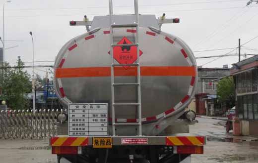 罐體有效容積:18立方米,危險貨物運輸車輛的類型為FL型,類項號:3;罐體尺寸(長×長軸×短軸)(mm)為:6850×2160×1500;側、后防護裝置材料材質:Q235B,側、后防護均采用螺栓連接,后防護裝置斷面尺寸為(mm):80×150,后部防護離地高度:500mm;隨底盤選裝駕駛室,選裝擋泥板,選裝箱門樣式,選裝正后外觀圖及炮筒樣式,選裝防護一側無工具箱;安裝具有衛星定位功能的行駛記錄儀,排氣管前置,安裝前輪盤式制動器和限速裝置,限速80km/h,僅采用底盤子午線輪胎;ABS型號/生產廠家:ABS 8/東科克諾爾商用車制動系統(十堰)有限公司;發動機型號及油耗值(L/100km)為:DDi75E300-60 (37.3).后軸采用空氣懸架;轉向輪安裝爆胎應急防護裝置.該車型可選裝ETC車載裝置;