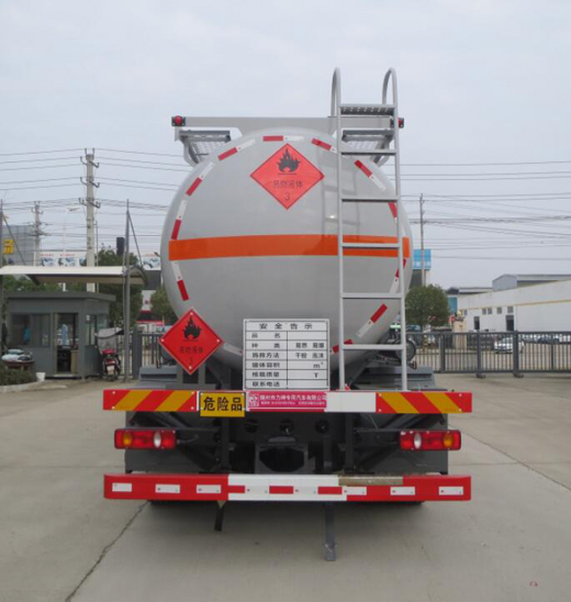 罐體有效容積:21.6立方米,危險貨物運輸車輛的類型為FL型,危險貨物類項號:3;罐體尺寸(長×直徑)(mm)為:7600×1950;僅采用1995+5000(mm)軸距,側、后防護裝置材料材質:Q235B,側、后防護均采用螺栓連接,后防護裝置斷面尺寸為(mm):80×150,后部防護離地高度:460mm;隨底盤選裝駕駛室,選裝出口箱及炮筒樣式;安裝具有衛星定位功能的行駛記錄儀,排氣管前置,安裝前盤制動器和限速裝置,限速80km/h,僅采用底盤子午線輪胎;EBS型號/廠家:EBS5/東科克諾爾商用車制動系統(十堰)有限公司;發動機型號及油耗值(L/100km)為:B6.2NS6B230(36.1),B6.2NS6B245(36.1).該車后軸為采用空氣懸架.轉向輪安裝爆胎應急防護裝置.該車型可選裝ETC車載裝置;
